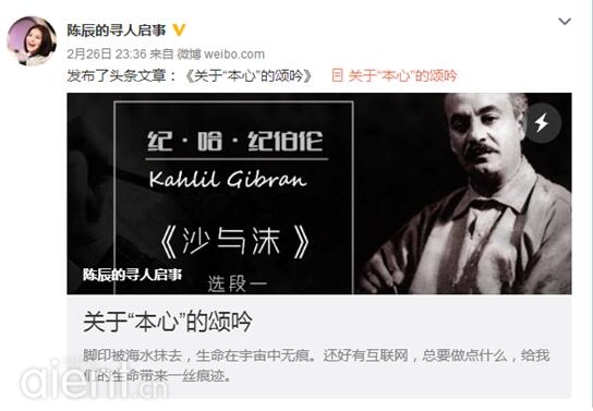 阅读,是陈辰非常喜欢做的事。哲学人类学是她最喜欢的阅读领域。比如她曾在微博上说过,纪·哈·纪伯伦所作的《沙与沫》,是她从学生时代就十分喜爱的一首散文诗。而她也会随着阅历的丰富,在思考的时候反复感受其中带来的哲学思辨,享受书籍带给自己的欢欣。