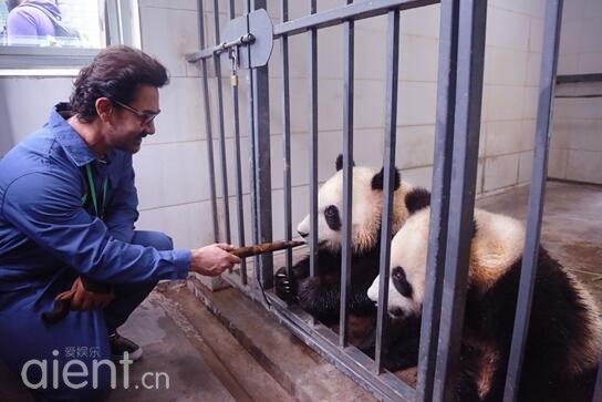 阿米尔·汗此次携最新力作《摔跤吧,爸爸》参加了北京国际电影节,并为新片在中国的推广展开宣传活动。在紧张的行程中,他特别抽出一天的时间来到四川成都体验,这里是他的偶像——成龙参与的《功夫熊猫》的取景地。在都江堰熊猫基地,这位银幕硬汉第一次近距离与熊猫接触,他还化身熊猫保育员,兴致勃勃地喂了熊猫竹子,并在科普馆讲解员的介绍下,了解到很多熊猫保护的相关知识,最后还和刚刚从国外回来的明星“宝宝”熊猫同框合影,圆了自己的熊猫梦。