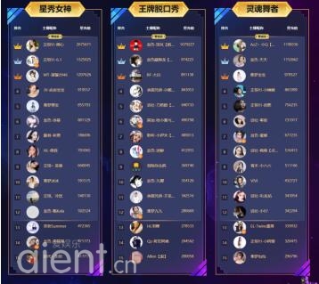 而星秀女神则聚集了画心、皮皮宝宝、萱宝等众多美女主播,画心暂时领先,其他主播则形成你追我赶的气势,毫不相让。在王牌脱口秀赛区,深坑也是独占鳌头。灵魂舞者的竞争则相当激烈,小Q、天天、集梦宝宝位列前三,且毫不相让,看来之后也必将有一场激战。