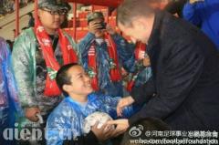 中国男足主教练阿兰·佩兰冒雨上看台看望郑州市儿童福利院孩子们,4月18日晚,河南建业VS贵州人和比赛现场,中场休息时,佩兰与河南...