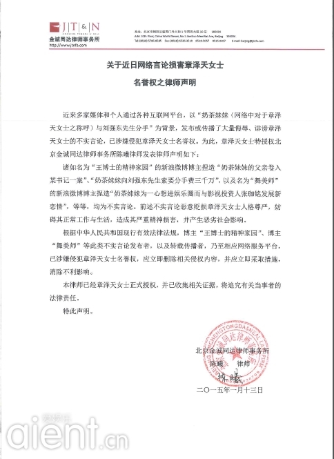 律师声明中写道,一些诸如“王博士的精神家园”的新浪微博博主捏造“奶茶妹妹的父亲卷入某书记一案”、“奶茶妹向刘强东先生索要三千万”,名为“舞美师”的新浪微博博主捏造“奶茶妹妹为一心想进娱乐圈而与影视投资人张珈铭发展新恋情”,等等,均为不实言论。不实言论恶意贬损章泽天女士的人格尊严,妨碍了其正常工作与生活,造成严重精神损害。要求对不实言论者及相关网络平台,立即删除相关侵权内容,并应立即采取措施清除不良影响。也已收集相关证据,将追究法律责任。