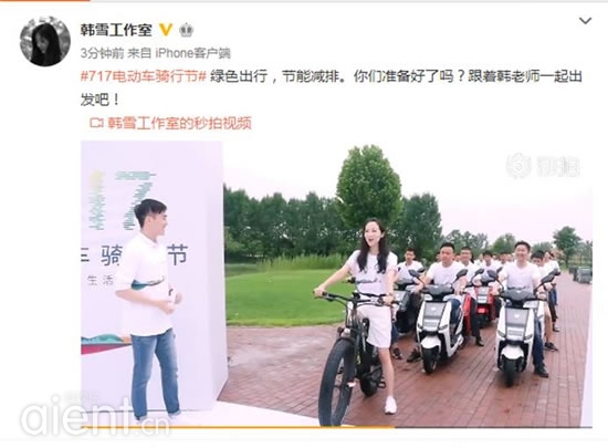 7月17日当天,韩雪工作室也积极加入到为环保发声的行列中,为本次活动积攒绿色环保能量。韩雪工作室微博中写道:“#717电动车骑行节#绿色出行,节能减排。你们准好了吗?跟着韩雪一起出发。”同时,还配有一段韩雪号召大家参与电动车骑行节活动而专门录制的小视频。