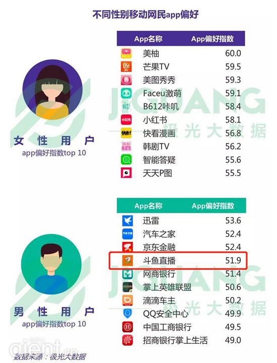 斗鱼CEO陈少杰是一名DOTA玩家,也因此斗鱼从最开始便刻下了游戏直播的基因,此后斗鱼专注于游戏直播,LPL、PGI到现在的TI8,各类大型赛事的直播,帮助斗鱼取得了非常耀眼的成就。在最近极光大数据发布的《2018年Q2移动互联网行业数据研究报告》,斗鱼表现抢眼,不仅在男性用户APP偏好指数TOP10榜单中以唯一的直播APP身份名列第四,也在市场数据方面名列前茅。