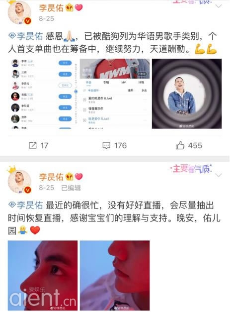 但随着时间的流逝,从抖音账号关注人的增长量来看,李昃佑的人气可谓是只增不减。在上半年受邀并出席了微博超级红人节和一直播两周年庆典活动后,李昃佑并未选择一夜爆红后的疯狂捞金,依然坚持苦练唱功,实力不仅没退步,反而日益精进。天道酬勤,八月份李昃佑被酷狗列到华语男歌手类别之中。而且在微博中李昃佑还表示,个人首支单曲也在筹备中,请粉丝耐心等待,实力宠粉。
