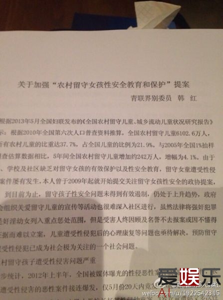韩红在新浪微博上发布了会上照片,能够看到她将会提出《关于加强“农村留守女孩性安全教育和保护”提案》和《关于农村土地确权中切实保障妇女权益的提案》。她在微博上说:“今年两个提案,不管有用没用,能否被相关部门关注和改善,我都要提!其中一个提案我已经第六次提出!总之,坚决不做无作为的委员!”