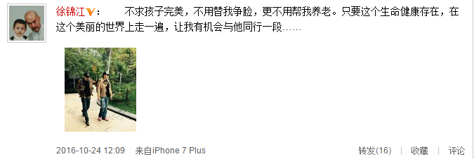 徐锦江和儿子 10月24日,知名演员徐锦江在微博中罕见晒出和儿子散步的合影,并写道:不求孩子完美,不用替我争脸,更不用帮我养老。只要这个生命健康存在,在这个美丽的世界上走一遍,让我