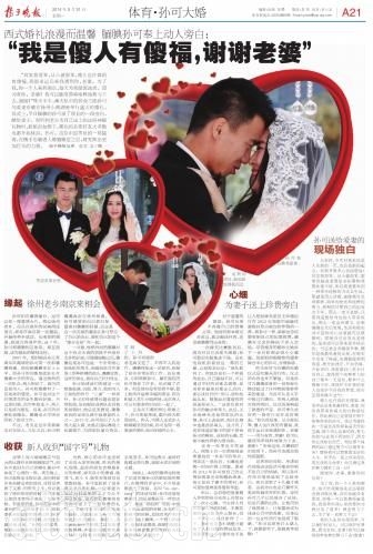 正是在石璐的细心照顾之下,孙可恢复神速,重归舜天和国家队。昨天,当两人正式步入婚姻殿堂的时候,孙可也用一场美丽的婚礼来回报他的公主。