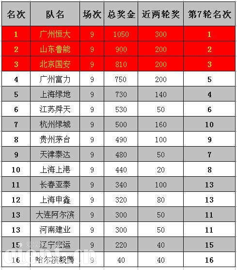 本轮中超奖金榜上,恒大以1050万元继续领跑;鲁能尽管败走长春,但是累积奖金仍超过北京国安;近两轮成绩不错的富力、绿城和亚泰排名都有所上升;近期表现不佳的泰达、上港、阿尔滨和建业排名则出现下滑。
